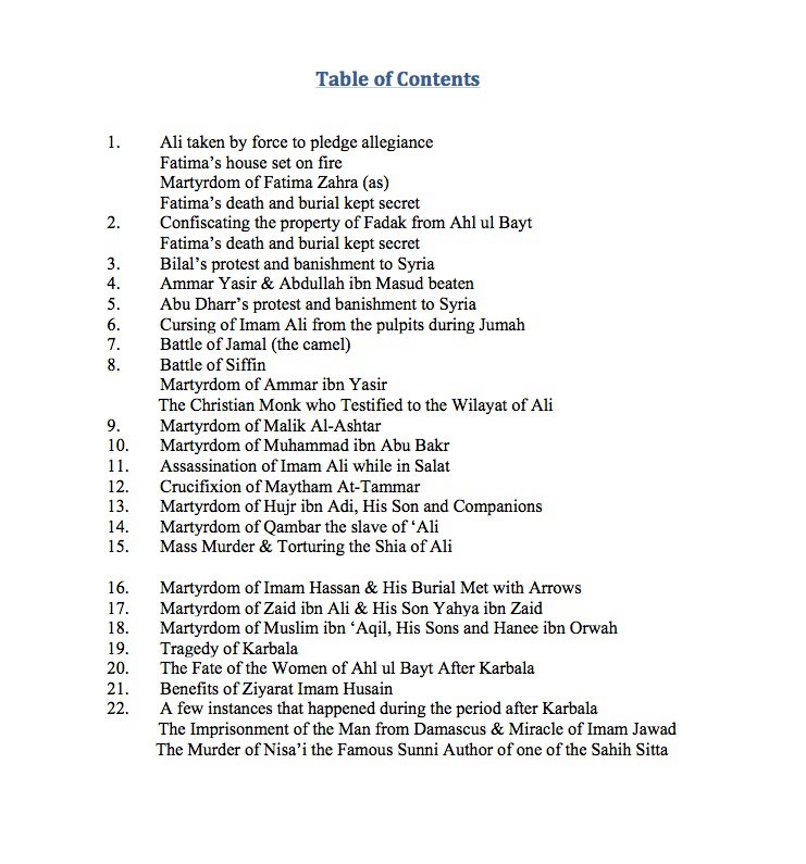 Study and see how the Family of the Holy Prophet (sawa) were treated after the martyrdom of our beloved Prophet (sawa). How the Prophet (sawa) was poisoned, How his beloved daughter Fatima (as) was crushed behind the door, whipped and made to miscarriage her unborn son Muhsin (as) all while they were setting fire to her house while her children the masters of the youths of paradise Hassan (as) and Hussain (as) were inside. How they stole her land of Fadak and source of income as a way to put economic sanctions on them. How Imam Ali (as) was made to suffer under the rule of these oppressive rulers who stole his rights and then eventually killed him by a fatal blow of a sword while he was in prostration to his Lord. How they tortured and killed his followers, the shia, by cutting out their tongues, burying them alive inside of walls, crucifying them, exiling them, cutting off their heads and the list goes on. How they poisoned Imam Hassan (as) then obstructed his body from being buried beside his Grandfather the Messenger of Allah (sawa). How they Brutally massacred Imam Hussain (as), his family, friends and even his 6 month old baby, while all of them had been without food and water for three consecutive days. How they imprisoned his women and children and made them march in chains from Karbala to the prison of Damascus while whipping them and with all of the heads of their loved ones mounted on spears in the front of the army of these devils. How all of the Imam’s to follow, except Imam Mahdi (atf), were all killed by poison.